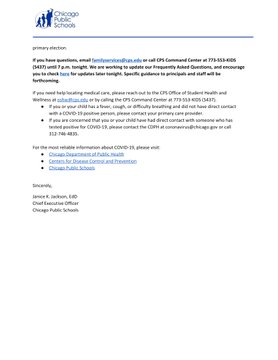 District Response to Coronavirus (COVID-19) Resources for Parents Frequently Asked Questions March 13 School Closure Announcement March 13, 2020 – Dear CPS Parents, Families, and Staff, The past several weeks have been difficult as we’ve watched the COVID-19 health crisis impact countries around the world, and now our home. Today, Governor Pritzker announced that all Illinois schools, including Chicago Public Schools, will close beginning Tuesday, March 17 through Monday, March 30. Classes are currently scheduled to resume on Tuesday, March 31. School-sponsored activities, events, field trips, and athletic events are also canceled during this time. I recognize the impact this closure will have on our community, and I know it will greatly burden our students, staff, and working families who rely on our schools. I want to assure you that COVID-19 will not stop our work on behalf of children. We are one family with one goal, and we are here to support you. Important Information for Families and Staff All school buildings will be closed for deep cleaning. Schools will be closed to all students and staff beginning Tuesday, March 17 through Monday, March 30. Only environmental cleaning experts will be allowed in school buildings along with essential staff. Families should not send their children to schools. Healthy meals will be available to our students. We recognize that our schools provide healthy meals to many of our students, and we will be providing free food boxes that will contain three days of breakfast and lunches for every student in the household. All families will be able to pick up meals at their nearest CPS school beginning Tuesday, March 17, between 9 a.m and 1 p.m. daily. Lunchroom staff will prep, bag, and provide meals outside of the school building. Schools will be sending enrichment resources and materials home with students. On Monday, March 16, school-based staff will send resources home in hard copy and online format. School-based staff members will also help students remember to take supplies, personal belongings, medications, and other materials home with them. All full-time and regularly scheduled staff will be paid throughout this time. School staff will not have access to school buildings during the closure. Central and network offices will be open only for emergency personnel. Emergency personnel are considered to be those who perform essential district functions. All other central and network office staff will be asked to telework or will be excused with pay. More information for staff will be forthcoming over the weekend. Polling sites will remain at CPS locations. Deep cleaning at those schools will not begin until after the primary election. If you have questions, email familyservices@cps.edu or call CPS Command Center at 773-553-KIDS (5437) until 7 p.m. tonight. We are working to update our Frequently Asked Questions, and encourage you to check here for updates later tonight. Specific guidance to principals and staff will be forthcoming. If you need help locating medical care, please reach out to the CPS Office of Student Health and Wellness at oshw@cps.edu or by calling the CPS Command Center at 773-553-KIDS (5437). If you or your child has a fever, cough, or difficulty breathing and did not have direct contact with a COVID-19 positive person, please contact your primary care provider. If you are concerned that you or your child have had direct contact with someone who has tested positive for COVID-19, please contact the CDPH at coronavirus@chicago.gov or call 312-746-4835. For the most reliable information about COVID-19, please visit: Chicago Department of Public Health Centers for Disease Control and Prevention Chicago Public Schools Sincerely, Janice K. Jackson, EdD Chief Executive Officer Chicago Public Schools